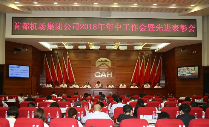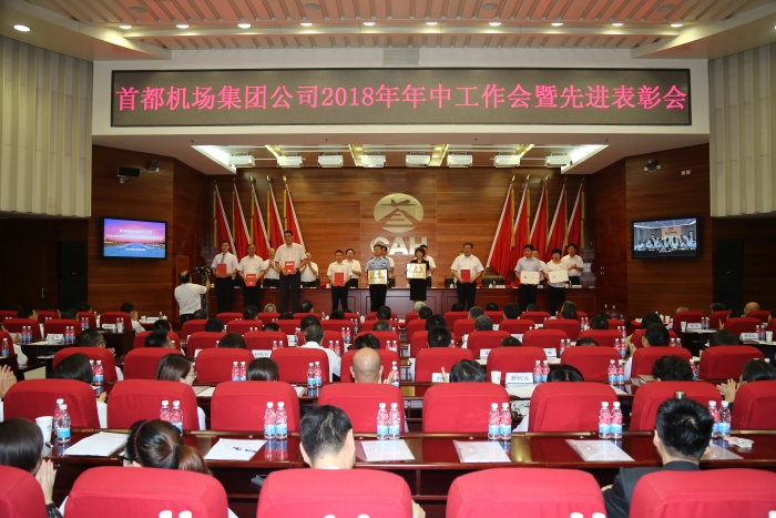 本网讯(集团公司新闻信息中心:相俞合报道)7月24日上午,集团公司召开2018年年中工作会暨先进表彰会。集团公司总经理刘雪松作了题为《保安全 抓建设 促改革 为集团公司的新征程开好局》的工作报告。集团公司党委书记宋胜利传达2018年全国民航年中工作会议精神并宣读《关于表彰首都机场集团公司先进基层党组织、优秀共产党员和党务工作者的通报》及荣获全国先进集体和个人名单。集团公司常务副总经理王星主持会议。集团公司副总经理高世清、姚亚波,总法律顾问、工会主席马正,副总经理韩志亮、阎欣,党委副书记、纪委书记刘建红,总会计师郏建青出席会议并为获奖集体和个人代表颁奖。
