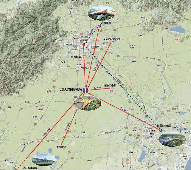 北京大兴国际机场(见图1-1)坐落于北京市大兴区榆垡镇、礼贤镇与河北省廊坊市广阳区的交界处,距北京市中心46公里、距雄安新区55公里、距天津市中心81公里、距廊坊市中心26公里、距保定市中心110公里。北京大兴国际机场定位为“大型国际枢纽机场”,近期规划目标年为2025年,按照年旅客吞吐量7,200万人次、货邮吞吐量200万吨设计。