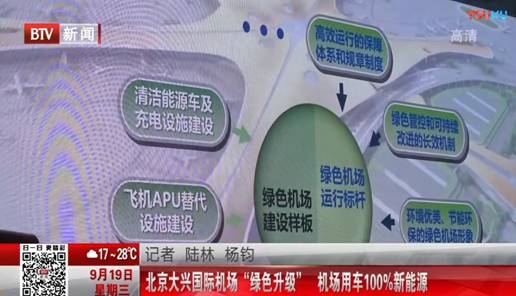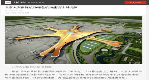 中央电视台新闻频道重点报道首都机场、北京大兴国际机场等国内八家机场率先发布“油改电”实施方案和北京大兴国际机场打造低碳、绿色机场相关情况;中央电视台财经频道对集团公司推进“油改电”工作,大力建设绿色机场情况进行了重点报道;新华网重点报道了北京大兴国际机场将打造高效运营的绿色机场相关内容;中国新闻网详细报道了北京首都机场集团公司下辖8大机场将分三类执行任务目标;中国交通报、中国民航报报道了首都机场集团推进实施“油改电”和绿色机场建设规划情况;北京日报、北京晚报等媒体报道了2020年首都机场集团公司所辖8大成员机场将明显提升环境空气质量及工作环境舒适度。