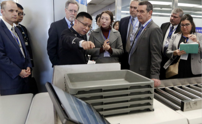 本网讯(安保公司:孙亚荣报道) 12月11日,美国运输安全局局长一行到首都机场二号航站楼安检现场进行考察交流,重点对安保公司自主研发的智能旅客安检系统进行了参观了解。安保公司总经理李万明、副总经理李志斌陪同参观。