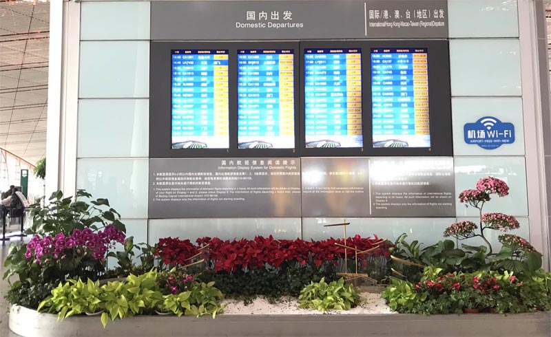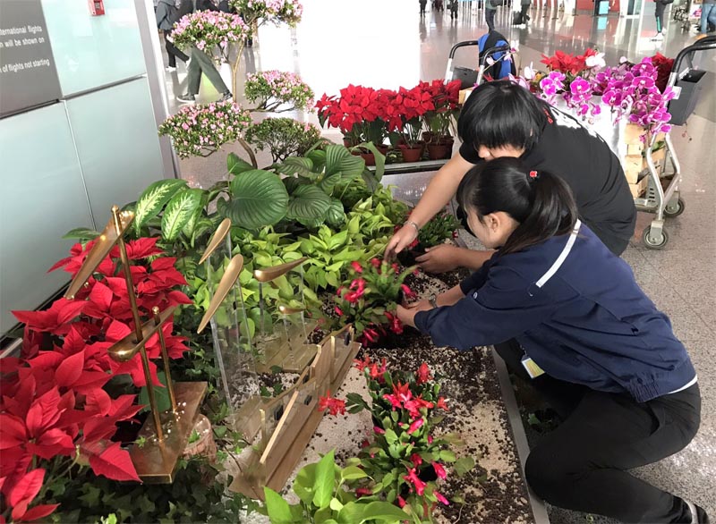 此次春节景观以杜鹃为主题展示花卉,杜鹃花是我国传统名花之一,花语有赞颂祖国昌盛、关怀思念友人之意,历来为人们所喜爱。在3号航站楼中央航显、2号航站楼国内中转等重点位置选用了更为名贵的造型品种——腊皮杜鹃。栩栩如生的孔雀造型、舒展雅致的盆景式造型、气势如虹的悬崖式造型,成为景观中的点睛之笔。搭配蝴蝶兰、大花蕙兰、一品红、金边百合竹、波斯顿蕨等植物,高低错落、参差有致,色彩斑斓和谐,营造喜庆之感,美化旅客乘机环境。此外,设计人员特别挑选了符合航站楼内消防标准的景观小品摆件,烘托节日气氛的同时确保消防安全,为归家旅客增添一份过年的喜悦。