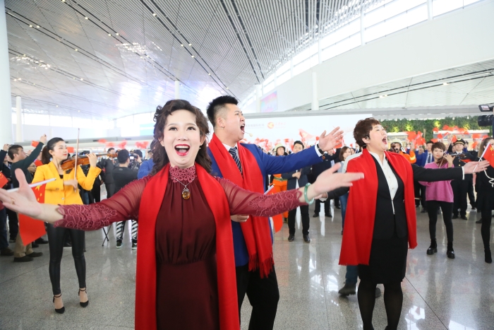 就在慰问演出结束不久,“我和我的祖国,一刻也不能分割,无论我走到哪里,都留下一首赞歌……”悠扬美妙的歌声突然响起。手中拿着国旗的人们边歌唱边在航站楼内人流密集区域不断聚集,原来是天津机场员工等百余人与天津著名艺术家李洋、张凯高唱《我和我的祖国》。振奋人心的快闪表演激发起来往旅客的爱国热情,大家共同歌唱祖国,演员们纷纷将手中的国旗传递给旅客,天津机场航站楼内外洋溢着温暖与感动的氛围。