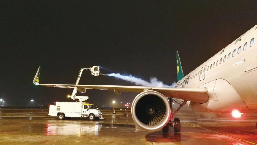 天津机场地勤部提前布置,高效完成早出港航班除冰工作。(天津机场 顾海亮/摄)