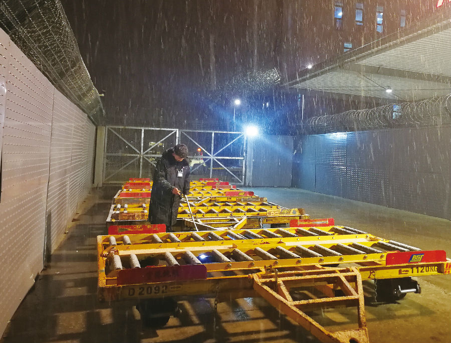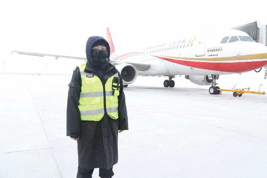 全副武装,迎战风雪。(内蒙古机场集团 赵素/摄)