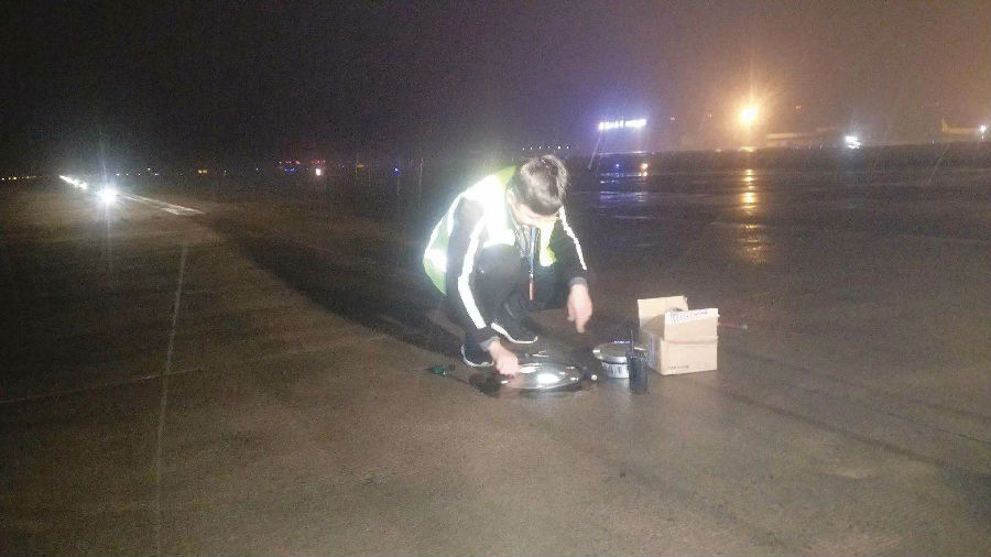 雪夜下,助航灯光人员巡检外场灯光,并对故障灯具及时进行维修。(河北机场集团 杨光华/摄)