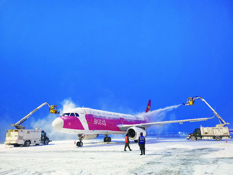 哈尔滨机场机务保障部以雪为令,出动10台除冰车对飞机实施除冰作业,确保飞行安全。(黑龙江机场集团 韩冰/摄)