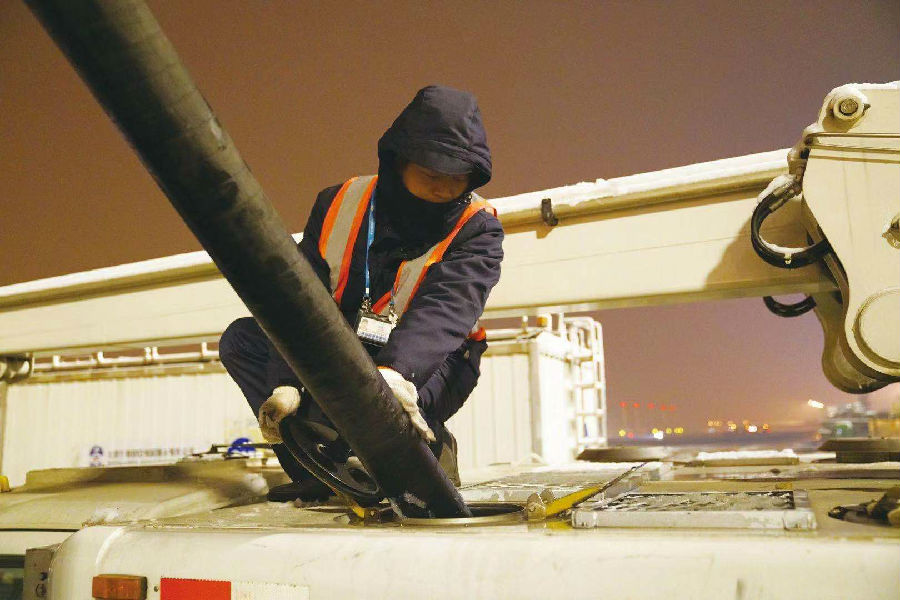 寒冷夜里,员工认真为除冰车补充除冰液。(地服公司 田臣/摄)