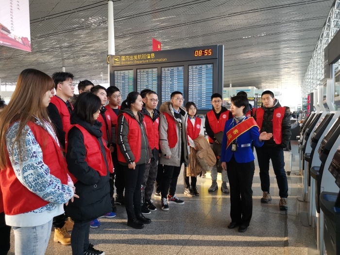 1月10日,春运首日,天津机场“暖冬行动”的春运志愿者们身披绶带,从早8:30至晚16:30,分2个班次,开始在航站楼出发大厅、自助值机柜台、交通中心、行李提取区域这4个点位提供流动式服务。