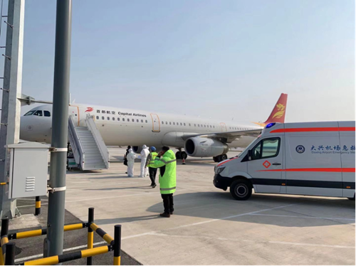 保障疑似疫情航班,引导急救车第一时间到达现场。大兴机场 吴姗姗/摄