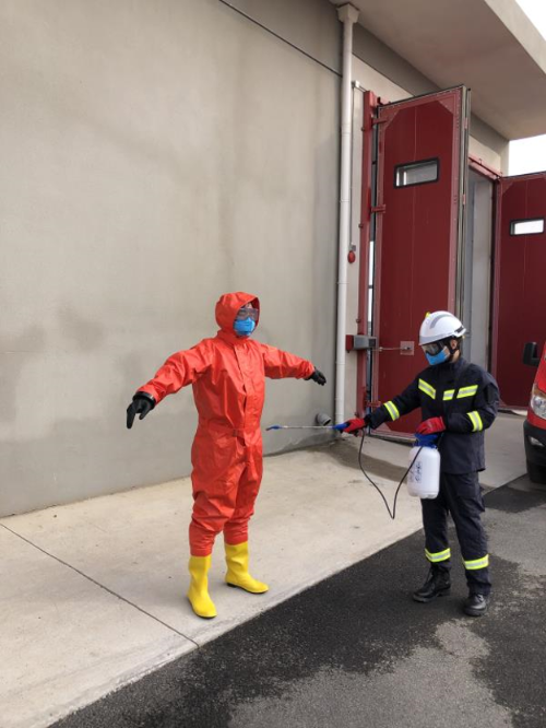 消防站对执行完任务的一线员工进行消毒。沈健/摄