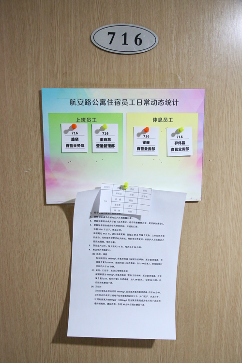 管理可视化。以外防输入,内防扩散的工作原则,商贸公司公寓在织密管控网络的基础上,以《工作指导》和管理手册为抓手,将岗位职责、工作规范、房间消毒以可视化的方式张贴在每间公寓的显著位置。在公寓防治过程中,商贸公司及时发现了对部分流动人员的管理盲区,分析研判后,即刻拟发《关于进一步加强公寓管理工作的通知》,通过摸排,锁定实际住宿人员信息后进行登记备案,并在每个房间外明示当日上班员工和休息员工情况,形成员工之间相互监督、相互提醒、相互关爱、共同防控的抗疫战争格局。
