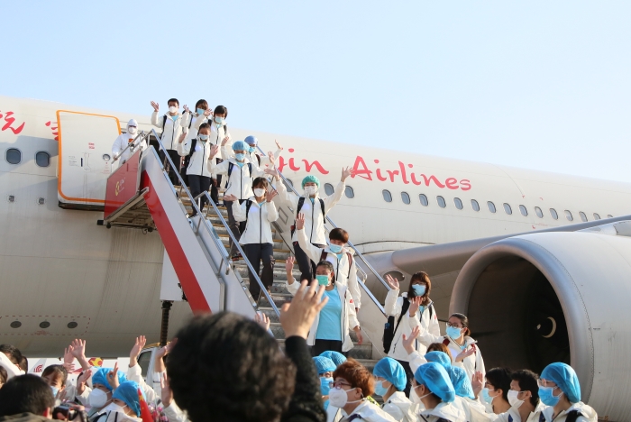 本网讯(天津机场:胡晓红报道) 3月17日14时57分,天津市首批支援湖北医疗队乘坐的航班落地天津滨海国际机场。当天下午,共有7批738名支援湖北的医疗队员乘坐4架包机返津,天津机场以最高的敬意和贴心的行动欢迎英雄们回家。