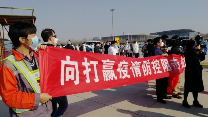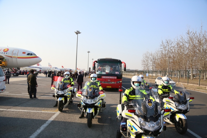 天津机场提前为返津医疗队做好最优的机位安排,地面保障部门快速做好驳运衔接。地面服务人员提供志愿服务,并拉起“迎接英雄们凯旋归来”的横幅,他们高举自己手工制作的“最美逆行者”、“欢迎回家”的卡片向医护人员致敬,引导大家顺利下机。天津机场为进场接送医疗队的车辆开通绿色通道,专门安排车辆进行引导,同时做好医疗队员的行李保障工作。机坪上,天津机场民警列队为医疗队员乘坐的大巴车护航,并向大家敬礼致意。