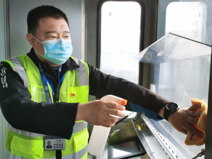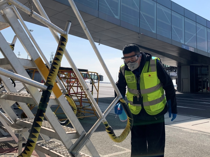 李鹏对疫情地区重点航班进行消毒。沈强摄