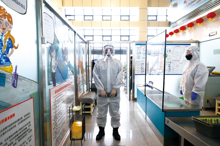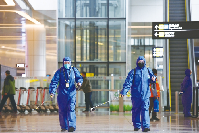 长春机场应急救援中心员工对航站楼进行消毒消杀,做 到全方位、全覆盖,不留死角。