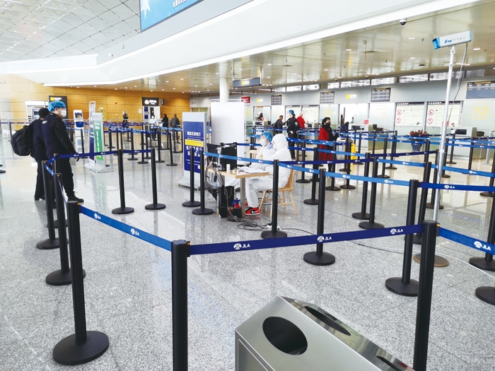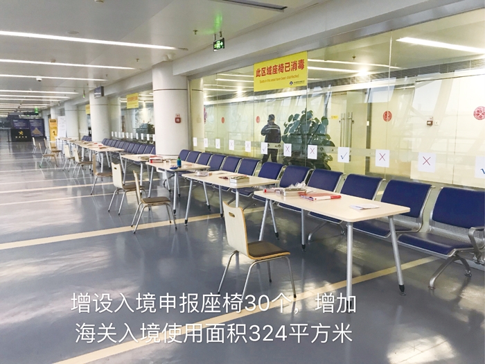 针对境外疫情蔓延态势,长春机场配合机场海关扩展了1号航站楼进 港区域旅客入境等候测温区面积共324平方米,增设入境申报座椅30个。