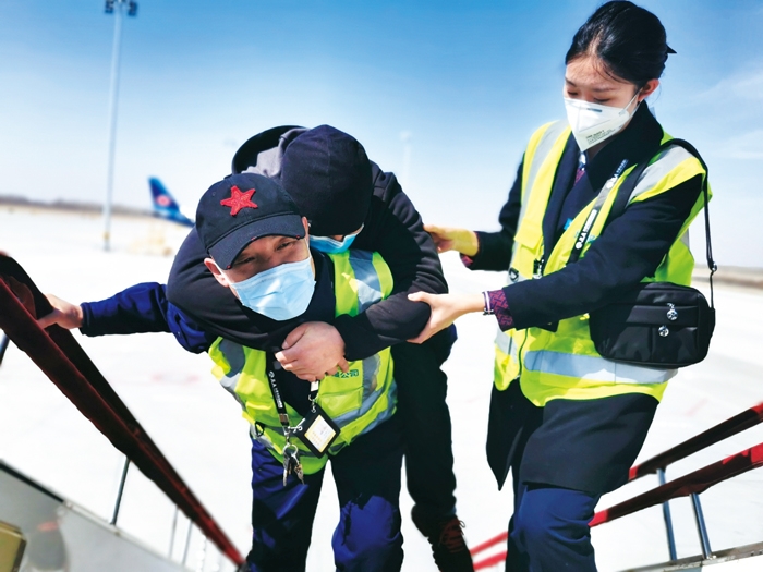 长春机场“特车人”践行真情服务,保障行动不便的旅客顺利登机。