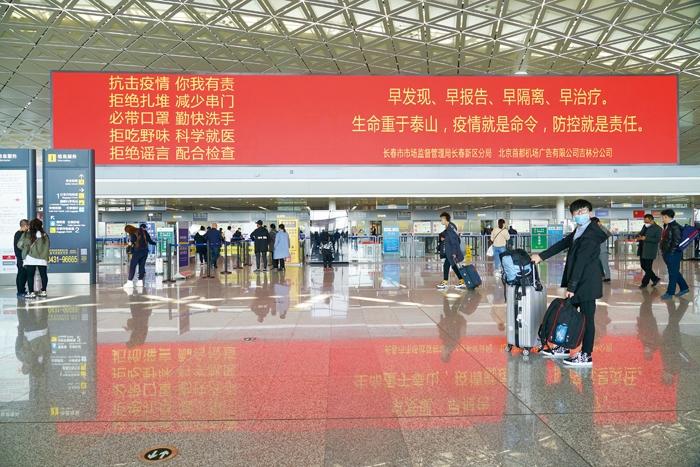 疫情期间,吉林机场集团所属各机场电子屏幕连续播放宣传片,引导旅客增强自我防护意识。