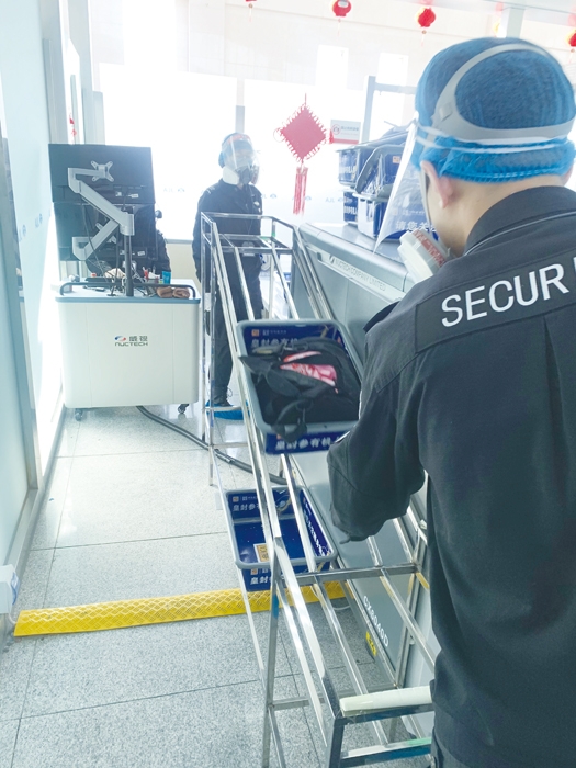 白城机场安检员巧妙运用“云梯传送台”进行行李传送,为旅客出行提供便捷、高效的安全检查。