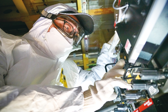 长春机场机务放行员全副武装,在密闭狭小的电子舱内,对飞机关键部件进行检测,确保运行安全。