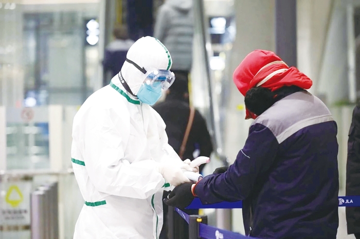 吉林机场集团机关党员突击队为旅客进行测温,全力做好联防联 控工作。