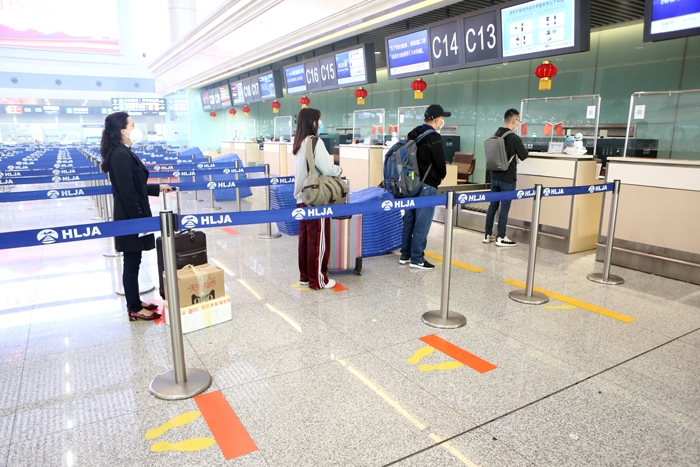哈尔滨机场在值机柜台、安检区域等设置“1.5米线”,成立旅客疏导现场处置组,加宽隔离带摆放,增加待检区旅客排队间距。