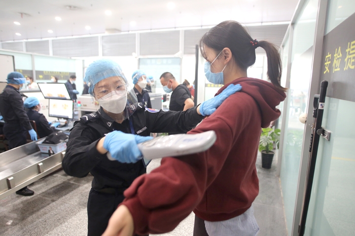 安检员加强个人防护,为旅客进行安检。