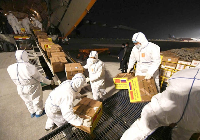 哈尔滨机场开通绿色通道,组织员工连夜装载运往俄罗斯的防疫物资,助力俄罗斯抗击疫情。