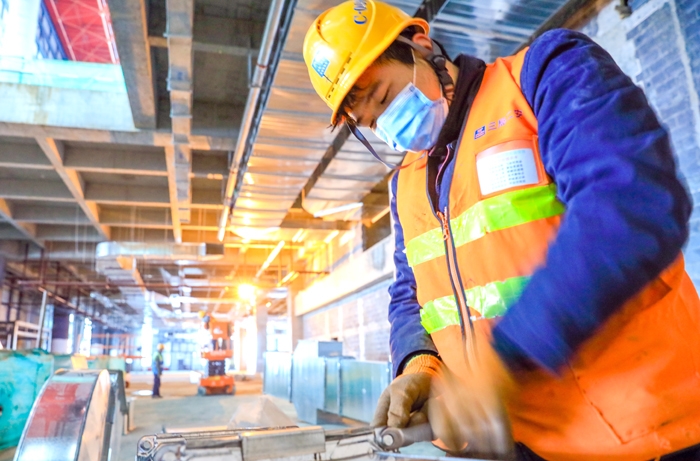 哈尔滨机场一期改扩建2号航站楼剩余部分施工现场,工作人员正在紧张作业。