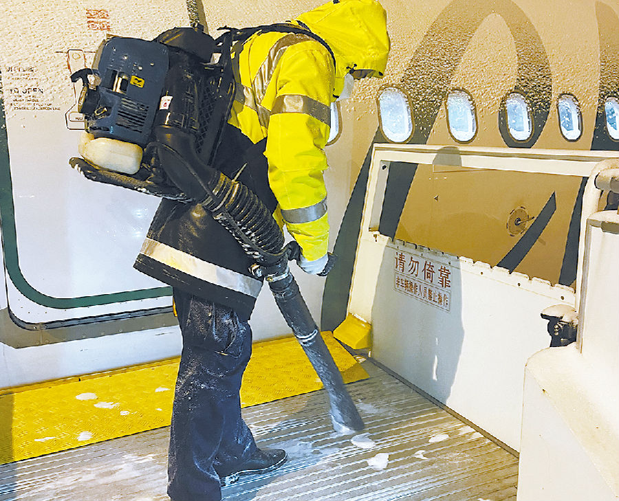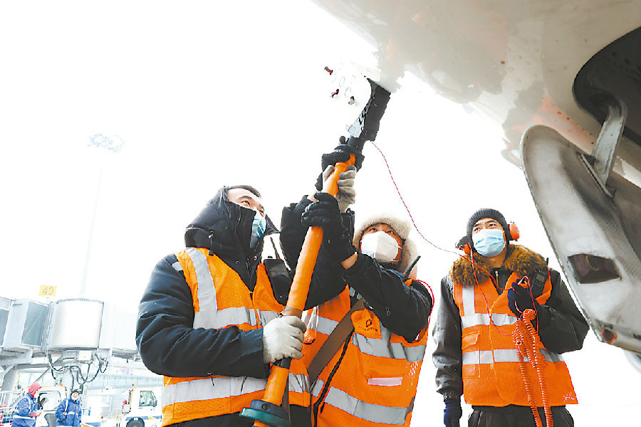 严寒中,首都机场飞行区员工坚守现场,组织保障航空器定点除冰。(首都机场股份公司 陈晨摄)