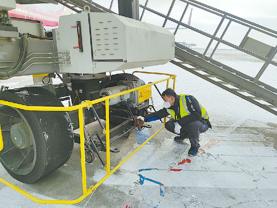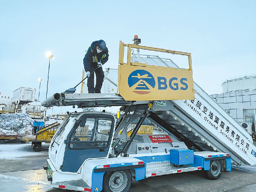 地服公司员工及时清扫客梯积雪,保障旅客登机安全。(地服公司 李跃摄)