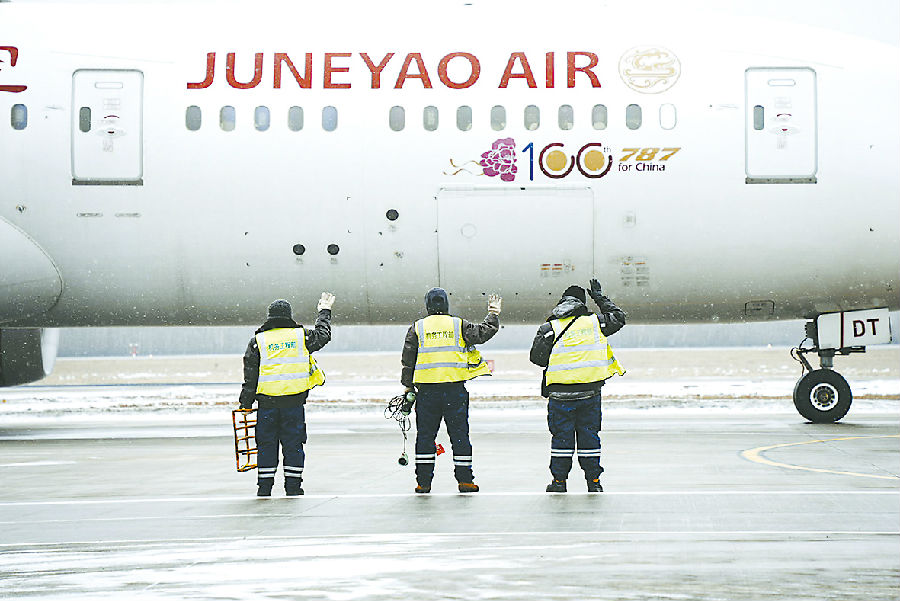 长春机场机务人员完成波音787航班送机工作,向机组和旅客挥手目送航班滑出。(吉林机场集团 杨项峰摄)