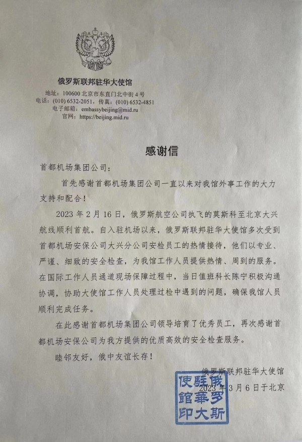 据悉,当日正值俄罗斯航空公司入驻大兴机场后,俄罗斯联邦驻华公使首次在大兴机场执行外交任务,面对新的环境、新的流程、新的环节,安保公司积极协调解决各类问题,副科长陈宁加强与航站楼管理部、运行监控指挥中心沟通联络,协助俄罗斯联邦驻华公使顺利完成外交任务。为此,俄罗斯联邦驻华大使馆特发来感谢信,对安保公司安检员专业、严谨的工作态度,陈宁科长及时、高效的帮助表示由衷的赞赏。