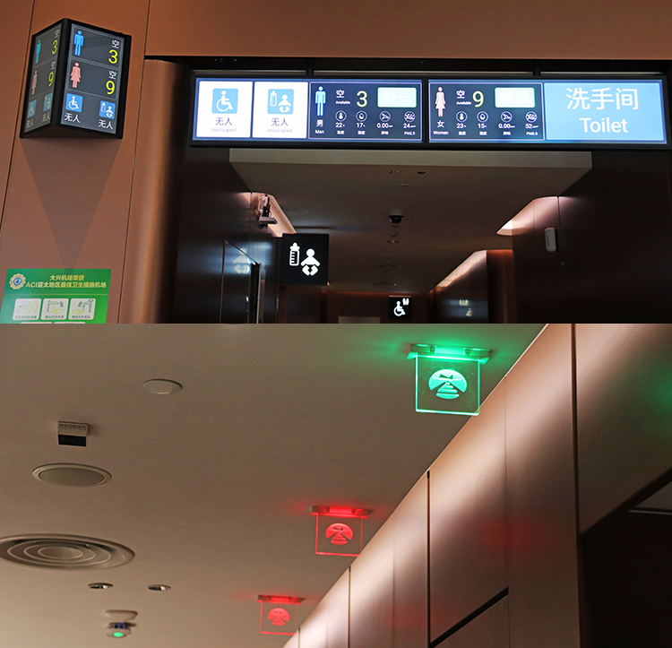 从旅客端来看,首都机场物业公司本着“以人为本,从细微处着手,彰显人性化”的原则,根据旅客需求打造厕位感应系统和显示引导系统。通过改造红外人体感应器、智能门锁等感应装置,感测厕位当前使用状态,将收集的数据以集成屏幕的形式提供给旅客。方便旅客在进入卫生间前便可了解其中可使用厕位余量情况,提前思量是否进入使用或选择附近其他卫生间。同时,通过在每个厕位门口处加装简单直观的“红绿灯”占位显示标识,引导旅客快速锁定可使用厕位,以提高旅客使用的快捷性和便利性。